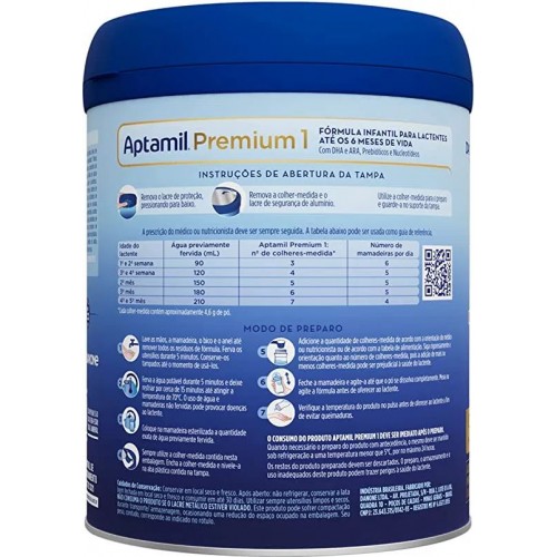 Aptamil Premium 1 é fórmula infantil de partida (0 a 6 meses) em pó, a base de proteínas lácteas, adicionada de prebióticos (0,8g/100ml scGOS/lcFOS). Contém DHA e ARA e nucleotídeos.
