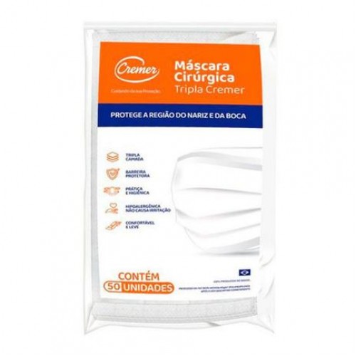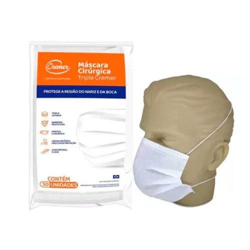 Indicada para reduzir a exposição a agentes microbianos e virais que possam ser inalados. Máscara fixada por trás da cabeça. Máscara tripla descartável em tecido não tecido (TNT). Confeccionado no estilo retangular, inteiramente em TNT, possui três camadas, com acabamento em toda a extremidade. Atóxica. 100% polipropileno. Não estéril. Não inflamável. Uso único. 96% retenção bacteriológica. Produto descartável, de uso único. Registro ANVISA: 80984050025.